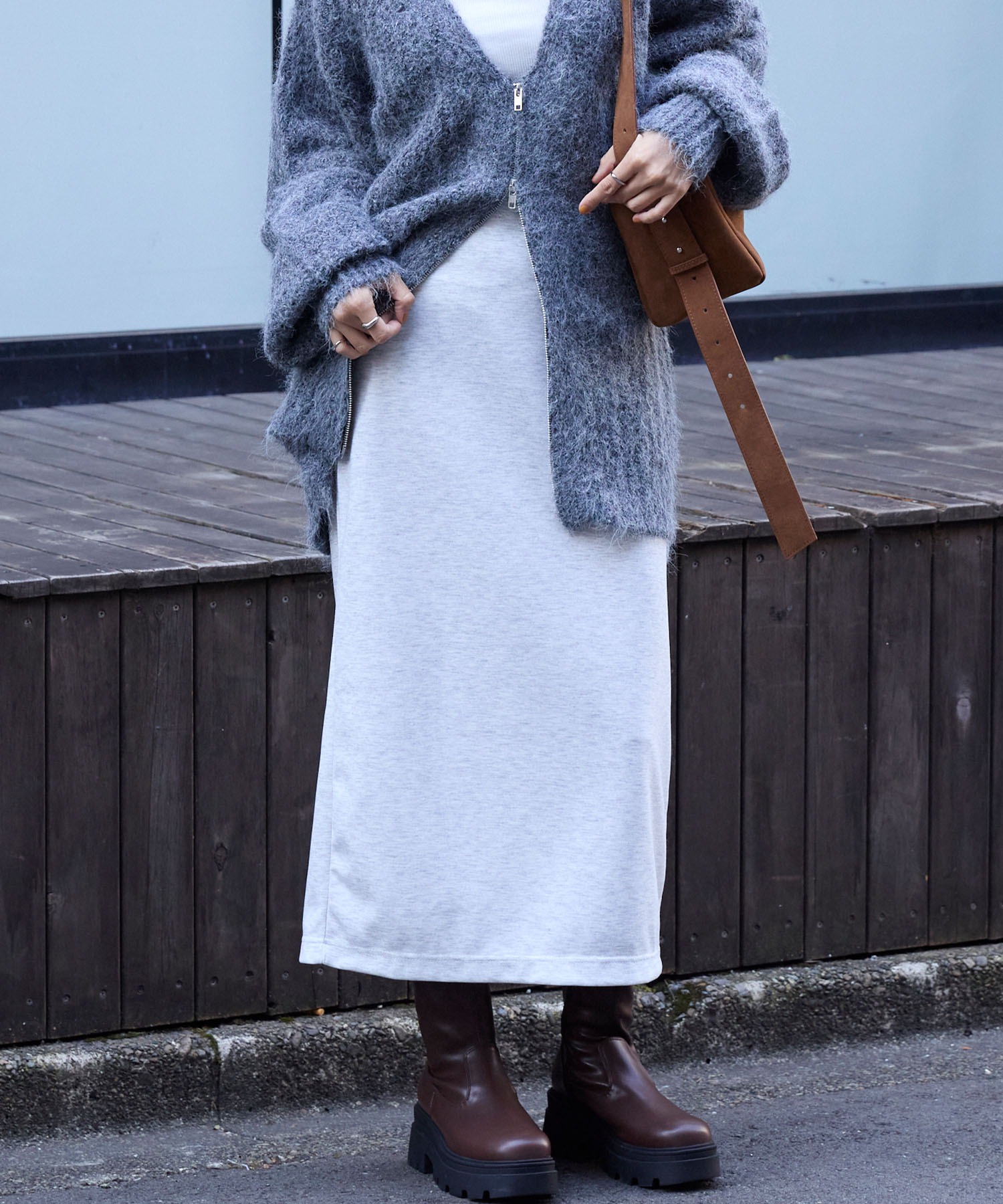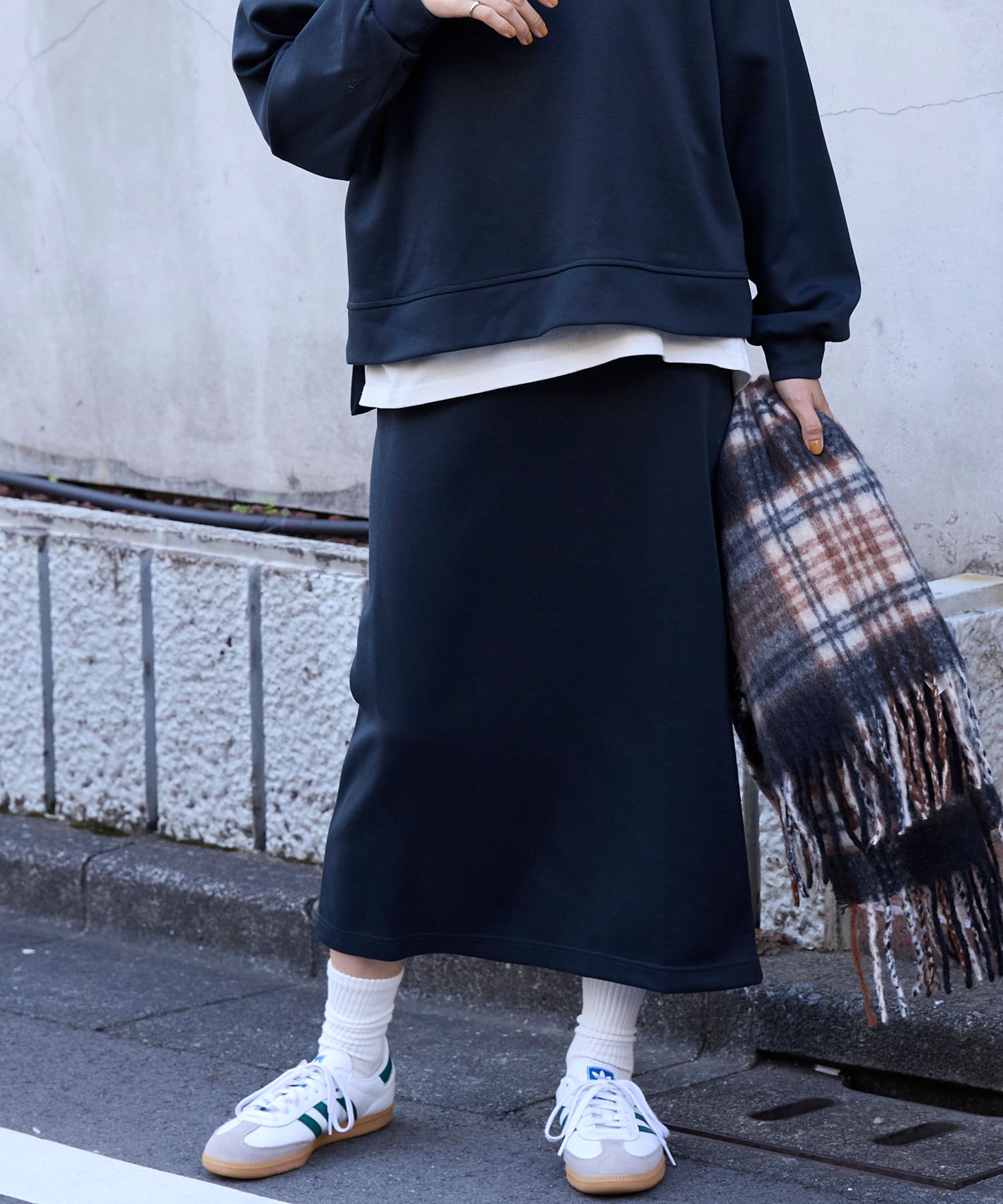 厚みのある生地感でももたつかず、程よく体に沿うラインが上品な印象に。