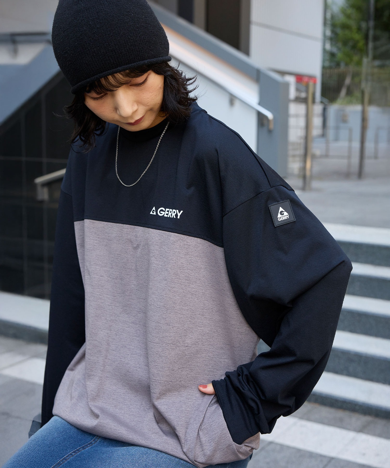GERRY/ジェリー 別注 <吸水速乾/UVカット/イージケア> ロゴワッペン ドロスト オーバーサイズ ファンクショナルファブリック長袖Tシャツ