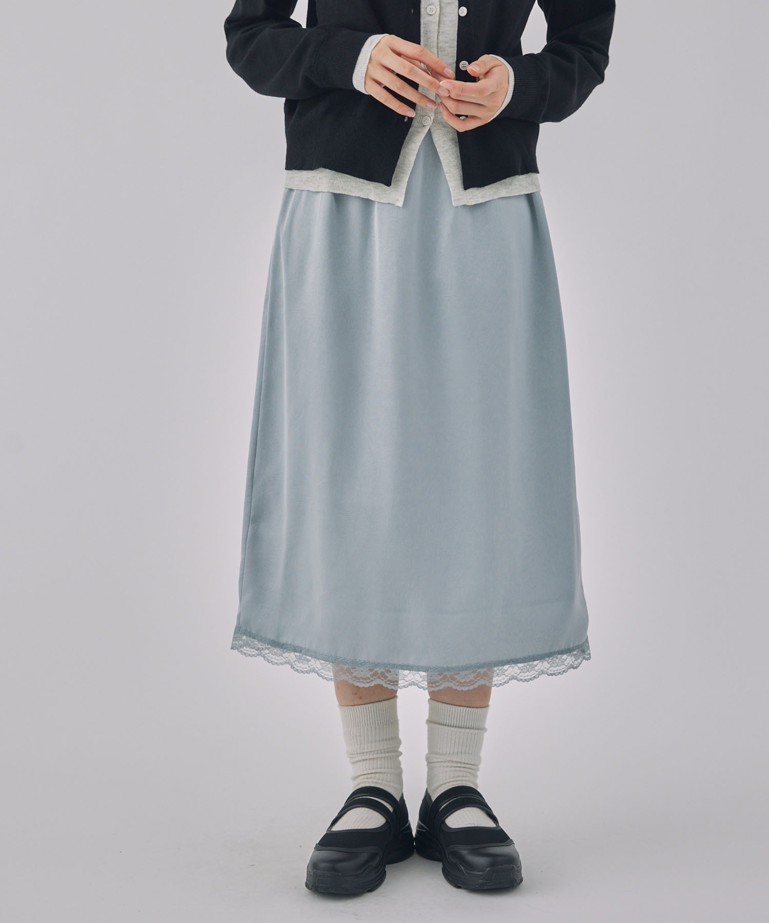 クラッシュサテン素材に裾レースをあしらったAラインスカート。