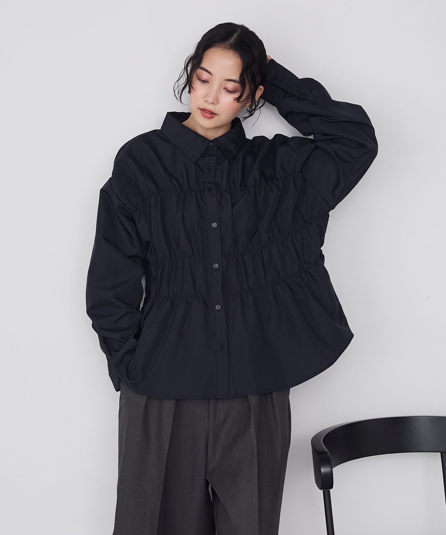 立体的なシャーリングデザインが目を惹く、ビスチェライクな長袖シャツ。