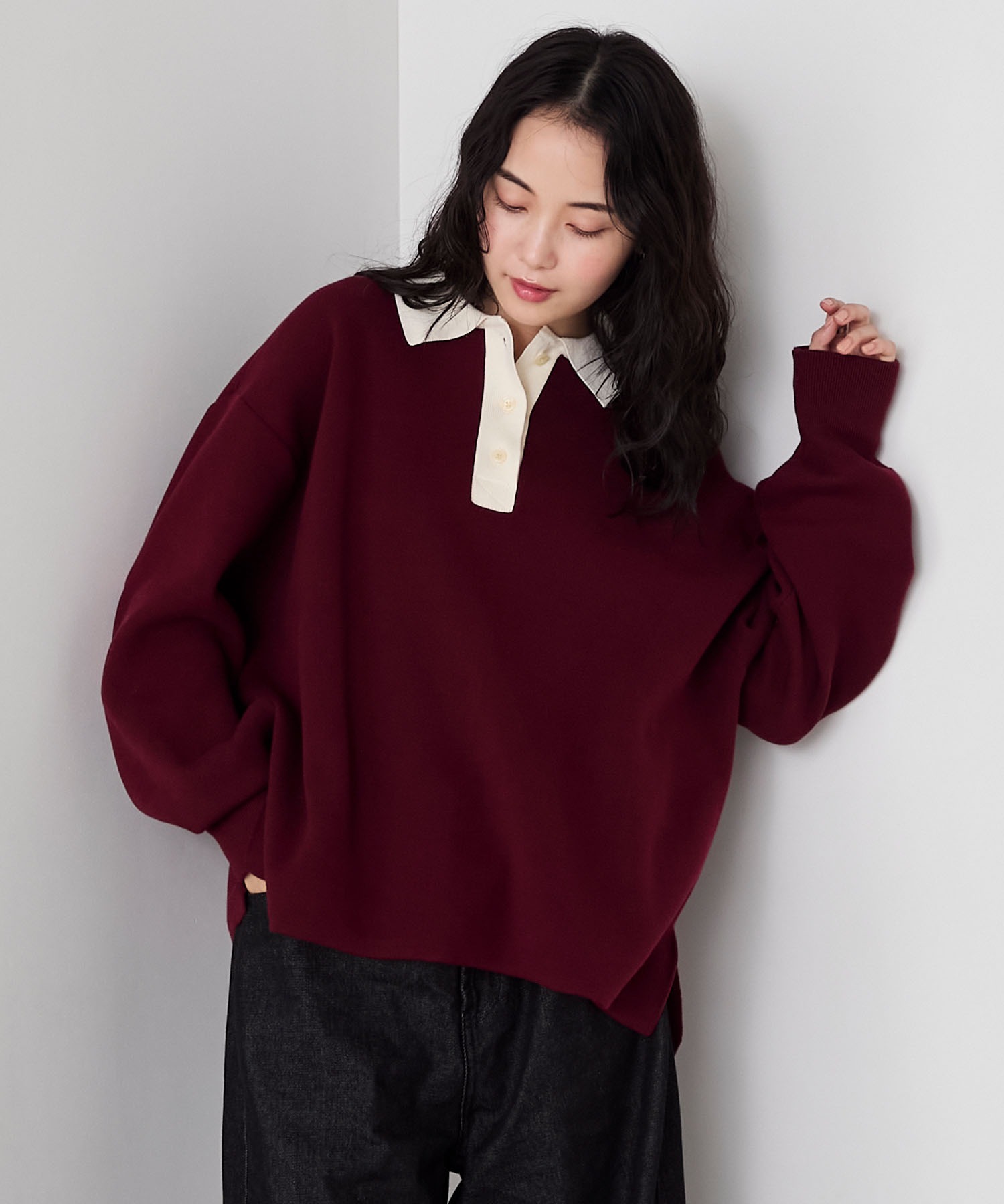 襟付きのヘンリーネックは身頃との配色でさりげないアクセントをプラス。